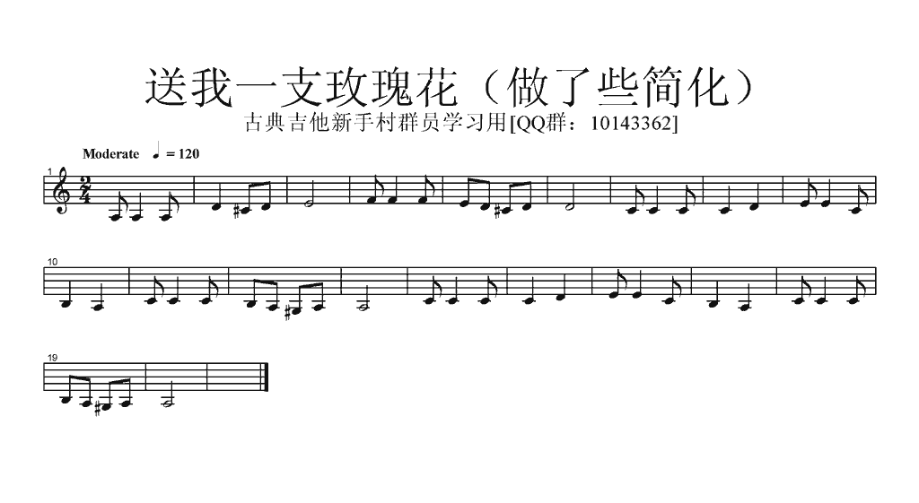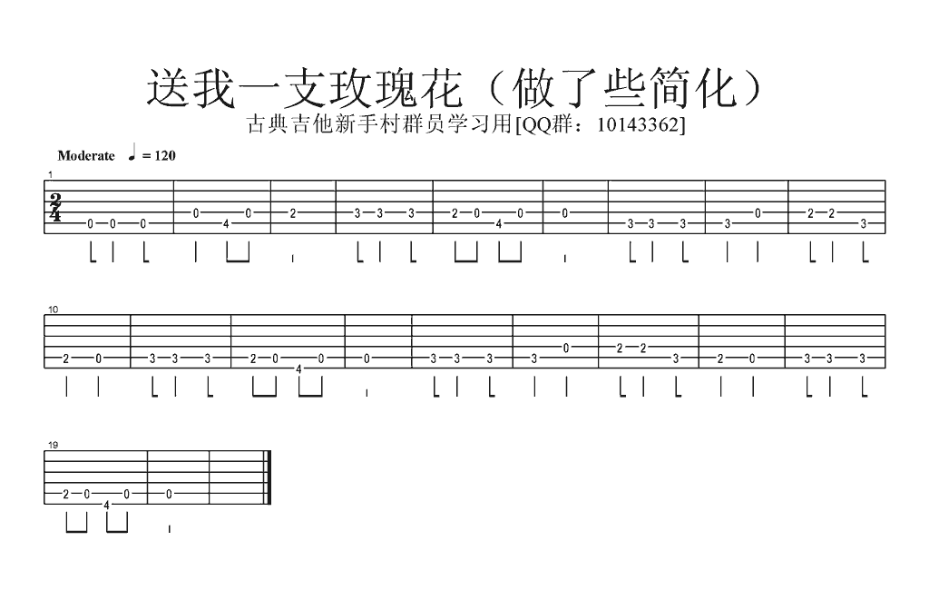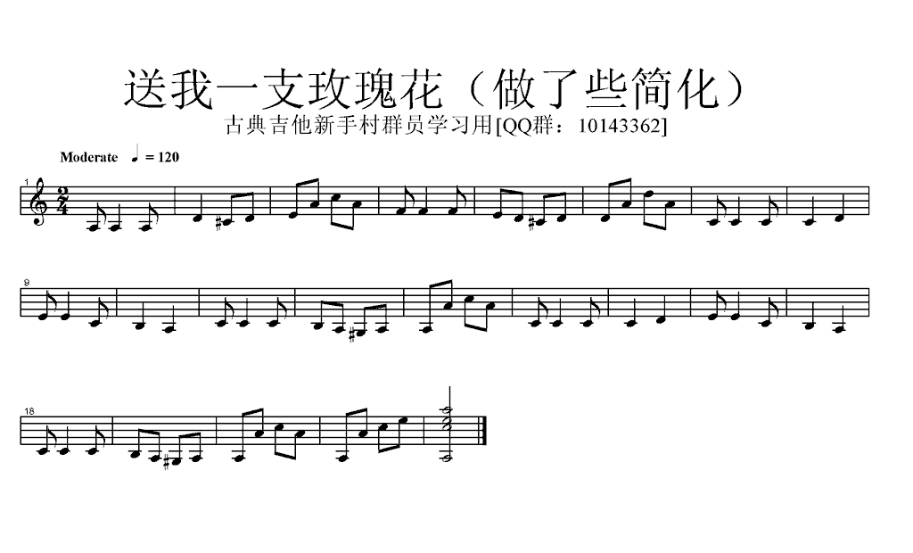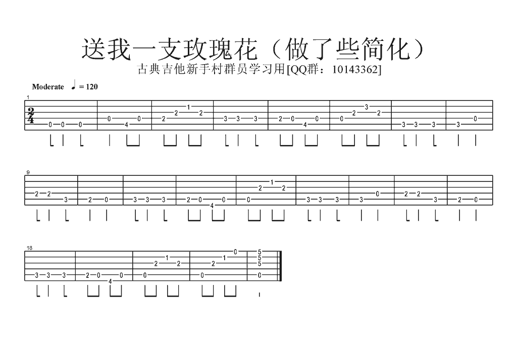 送你一支玫瑰花旋律改编的吉他谱:五线谱,六线谱 在旋律时值比较长的地方加了伴音的谱:五线谱,六线谱 上面所附的谱例是根据新疆民歌<送你一支玫瑰花>改编而来的,主要是进行了一下简化,时值不再那么复杂,易于初学吉他的朋友弹奏。 弹奏时要注意的是里面的切分音,关于切分音的具体的定义可能容易让人感到困惑:切分音是“变换小节中强弱拍位置的一种节奏”,如果对它有兴趣可以到网上查阅更多的资料,这里只说明这首曲子中属于切分类型的实际例子:第1小节,它的时值计算是:半拍+1拍+半拍,总共是2拍,你可以将中间的1拍想象成两个半拍,这样,这一小节共有4个半拍,实际弹的时候只要第3个半拍等待就可以了,可以在实际弹之前多打打节拍感觉一下;很多时候你要想弹得准确,首先要在心里能够唱准确,当你弹的时候等待的时间,在心里要有默唱的感觉,这样就能把时值弹准。 谱例的第二部分是在旋律的基础上,对几个持续2拍时值的音后面加了几个单音作为伴奏,这样避免听觉上的较长的停止,这样听起来有种相对完整的感觉,就如在唱歌时,遇到过门或者需要等待的时候哼唱副歌旋律或打下拍子类似。 |