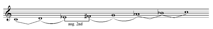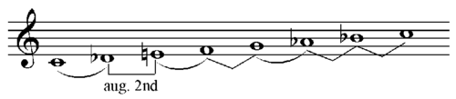 Gpysy Scale/Ciprian Scale:吉普赛音阶,吉普赛音乐中几种音阶类型的一种。 下面是两种吉普赛音阶类型: (1)小调吉普赛音阶可以通过将自然小调音阶中的第4个音升半音而得到,其音阶中各音的关系如下: 大二度/小二度/增二度/小二度/小二度/大二度/大二度(C,D,Eb,F#,G,Ab,Bb,C) 小调吉普赛音阶也称作Hungarian Gypsy scale(匈牙利小调音阶)。 ![]() (2)Spanish gypsy scale:西班牙式吉普赛音阶,这种音阶在钢琴上可以这样弹奏来得到:从E到E,除G使用黑键外(G#),其它的音都用白键;音阶中各音之间的关系如下: 小二度/增二度/小二度/大二度/小二度/大二度/大二度(例如:E/F/G#/A/B/C/D/E,C/Db/E/F/G/Ab/Bb/C) 这种音阶类型也是和声小调音阶的第五种模式,也称作:Phrygian major scale或Phrygian dominant scale或the Neapolitan minor scale或the Jewish (Freygish) scale。 ![]() |