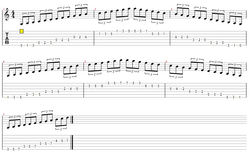 下面这条C大调各把位音阶练习中,每条弦固定弹奏3个音,尽管只是C大调音阶练习,但是它实际包括了其它一些调在不同把位的左手类型,除了象普通音阶练习一样应该注意到的左右手及其它一些要领之外,在这个练习中依然要强调熟悉掌握小二度和大二度音程在吉他上的实际表现,特别是在邻弦之间的实际表现,具体包括以下几方面: (1)小二度音程在一条弦上的表现为相邻的两个品格;大二度音程在一条弦上的表现是两个音之间隔一个品格; (2)小二度音程在邻弦上的表现:如果是在2/3弦,小二度音程表现为相隔两个品格,例如谱例中3弦4品的B与2弦1品的C,;如果是在其它的邻弦上,则是相隔三个品格,例如谱例中2弦5品的E与1弦1品的F; (3)大二度音程在邻弦上的表现:如果是在2/3弦,大二度音程表现为相隔一个品格,例如谱例中3弦5品的C与2弦3品的D;在2/3弦之外其它邻弦上大二度的表现为相隔两个品格,如谱例中6弦5品的A与5弦2品的B; (4)大调音阶构成规则中,3/4和7/8两个音之间为半音关系或者说是小二度,其它的都是全音关系或者说都是大二度音程; (5)在这个练习中换弦时,先确定这两个音之间的音程关系(小二度还是大二度),然后根据相应的音程在邻弦上的表现来确定位置,不要去死记实际的按弦位置; (6)左手指法安排:每条弦上的三个音如果其中包括一个小二度音程,则按弦不需要扩展,如果两个都是大二度音程,则需要扩展,第一个音使用食指,最后一个音使用小指,中间的音一般是使用中指; (7)这里提供的谱例只包括使用空弦的情况以及一个把位的示例,其它各把位自行向下推延即可; ![]() 其它相关链接: 每条弦只弹2个音的C大调音阶(小二度与大二度音程混合练习)—吉他与乐理(Guitar and Music Theory) 吉他学习-C大调低把位音阶 乐理知识及其在古典吉他中的实际应用-低把位C大调音阶/C Major Scale with Open String(Music Theory and Its Application in Classical Guitar) 每条弦3个音的小二度音程(半音阶)练习--吉他与乐理(Guitar and Music Theory) 半音阶练习中要注意的一些要点提示 乐理知识及其在古典吉他中的实际应用-半音阶练习/爬格子/Chromatic Scale Exercises(Music Theory and Its Application in Classical Guitar) 吉他新手学习—半音阶练习(爬格子)的一些基本类型及变化(1)(Basic Chromatic Scale Exercises and its changes on Guitar ) 什么是小二度?--吉他与乐理(Guitar and Music Theory) 什么是大二度?--吉他与乐理(Guitar and Music Theory) |