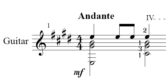吉他采用高音谱表(单谱表)记谱,记谱音高比实际音高高八度,如下图: