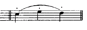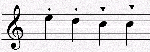 断音记号:有圆点、实心三角、圆点加弧线三种标记类型,表示某音或和弦要断续弹奏;三角形断音记号记在五线谱的下面时,尖要朝上。