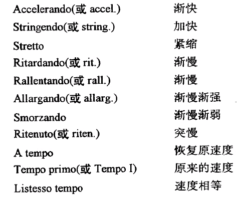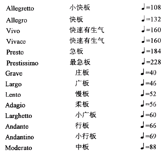 表示慢速用语:Largo 广板Lento 慢板 Adagio 柔板表示中速用语:Andante 行板Moderato 中板表示快速用语:Allegro 快板Presto急板表示速度变化用语:ritardando(略写rit.) 渐慢accelerando(略写accel.) 渐快a tempo 原速tempo rubato 速度自由