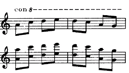 重复八度记号(标记) 将数字8记于音符上方或下方,表示相应的音符应高八度或低八度重复;如果是连续的多个音需要八度重复,则以con 8 ------记于需要八度重复的连续音的上方或下方,上方表示升高八度重复,下方表示降低八度重复。 下图中上面一行为记谱,下面一行为实际演奏: ![]() 其它相关链接: 吉他学习-看我学和声与乐理目录导航(Harmony & Theory) 吉他学习-阅读资料导航—乐理知识学习资料 |